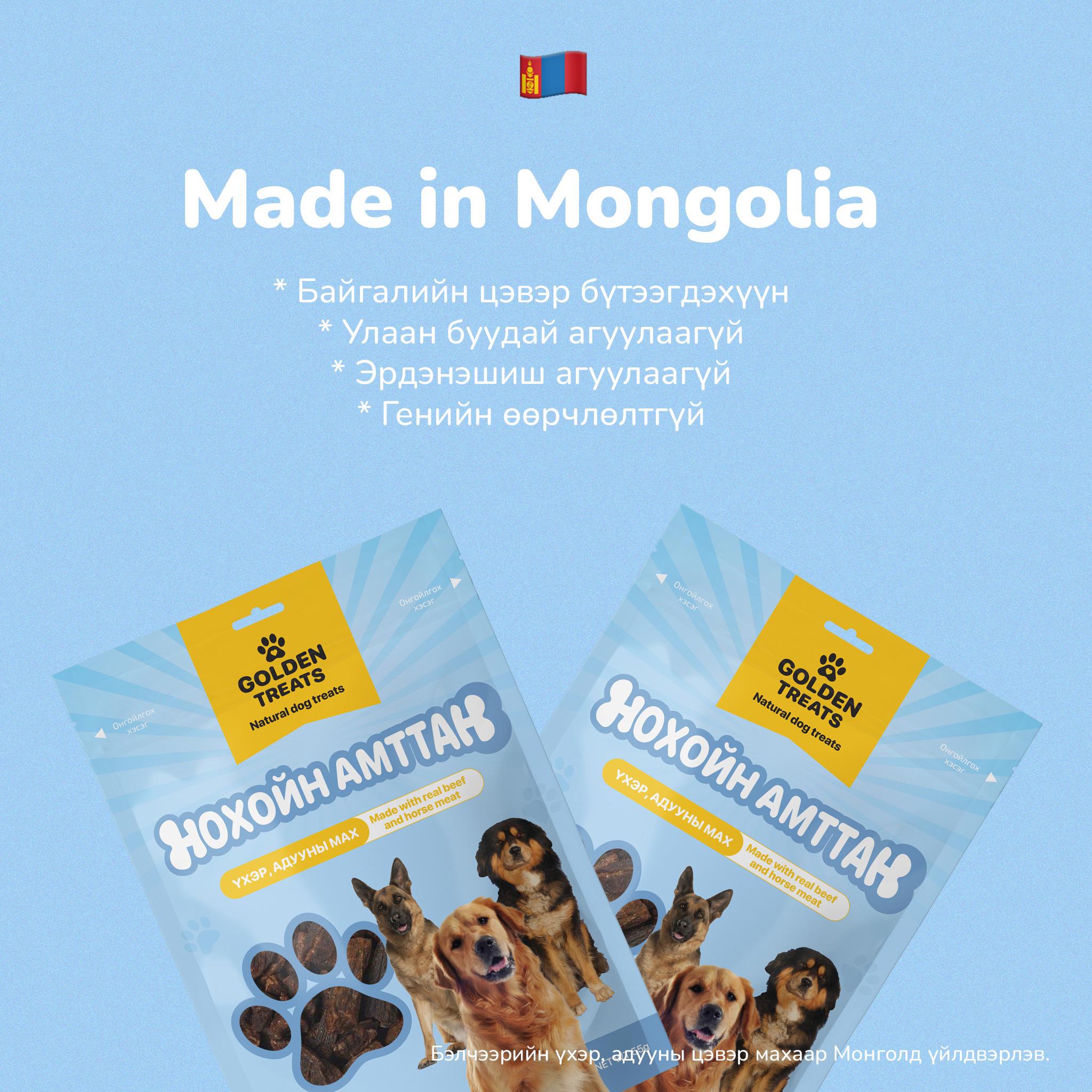 Голден трийт нь адууны мах, элэг, бөөр, чөмөг, яс, шөрмөсийг хатаасан, дээд зэргийн чанартай 100% байгалийн гаралтай нохойн амттан юм.
